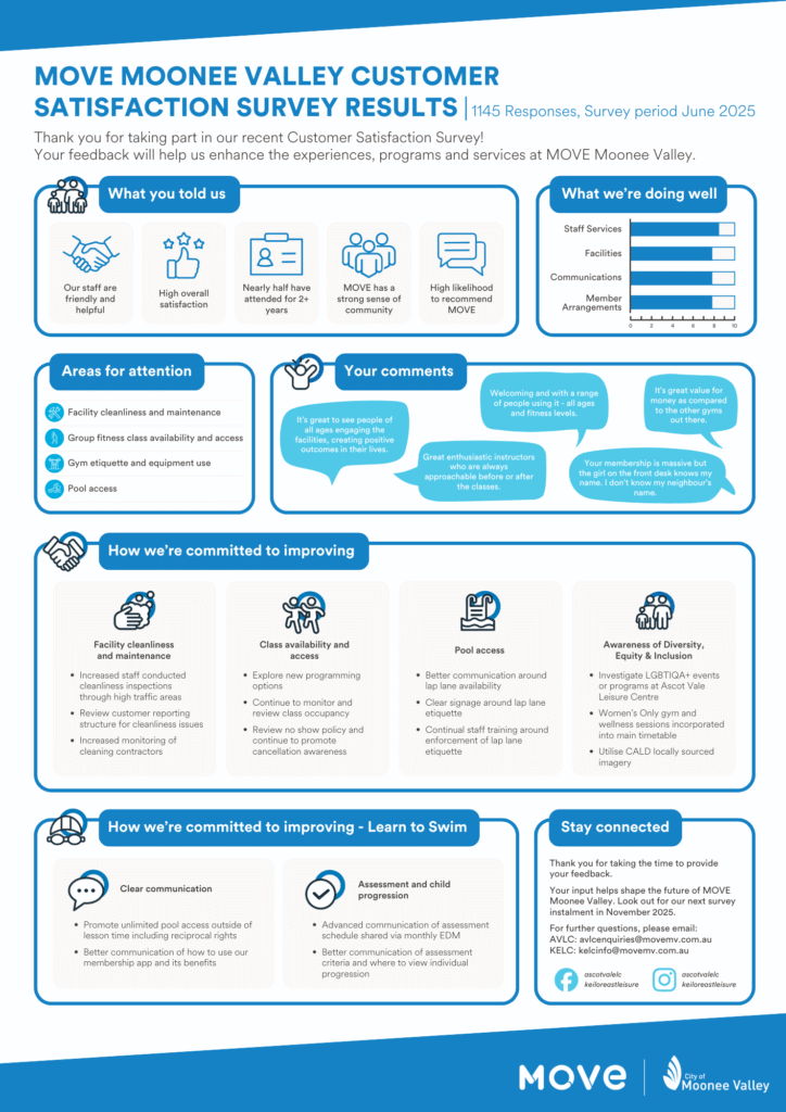 In June this year, the MOVE Moonee Valley leisure facilities distributed the Customer Satisfaction Survey to facility members, learn to swim members and multi visit pass patrons to ask about their experience with at the Councils leisure services, and seek feedback on their experience.