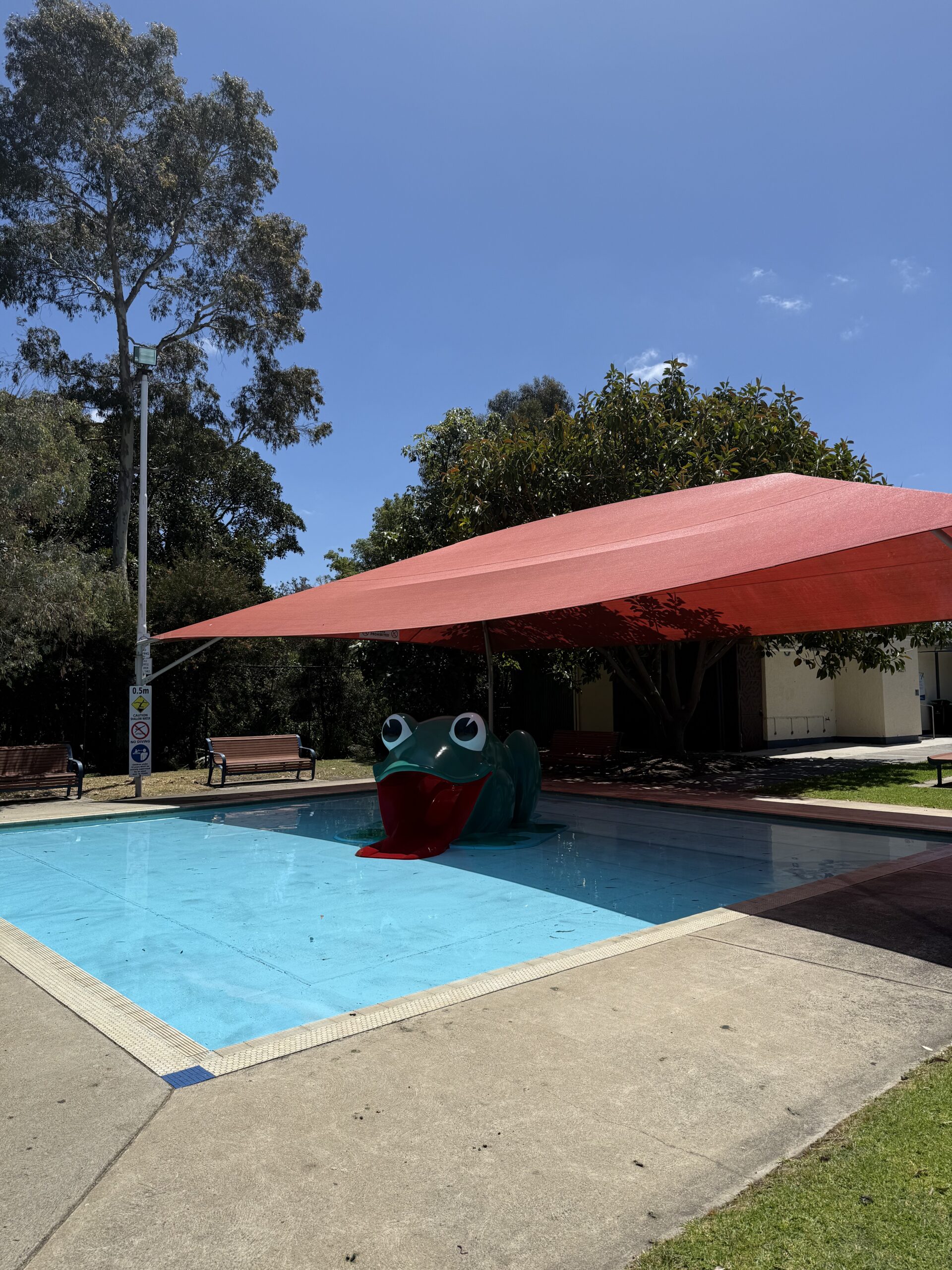 Our shallow shaded toddler pool has everything to entertain the little ones, including fun frog slide.